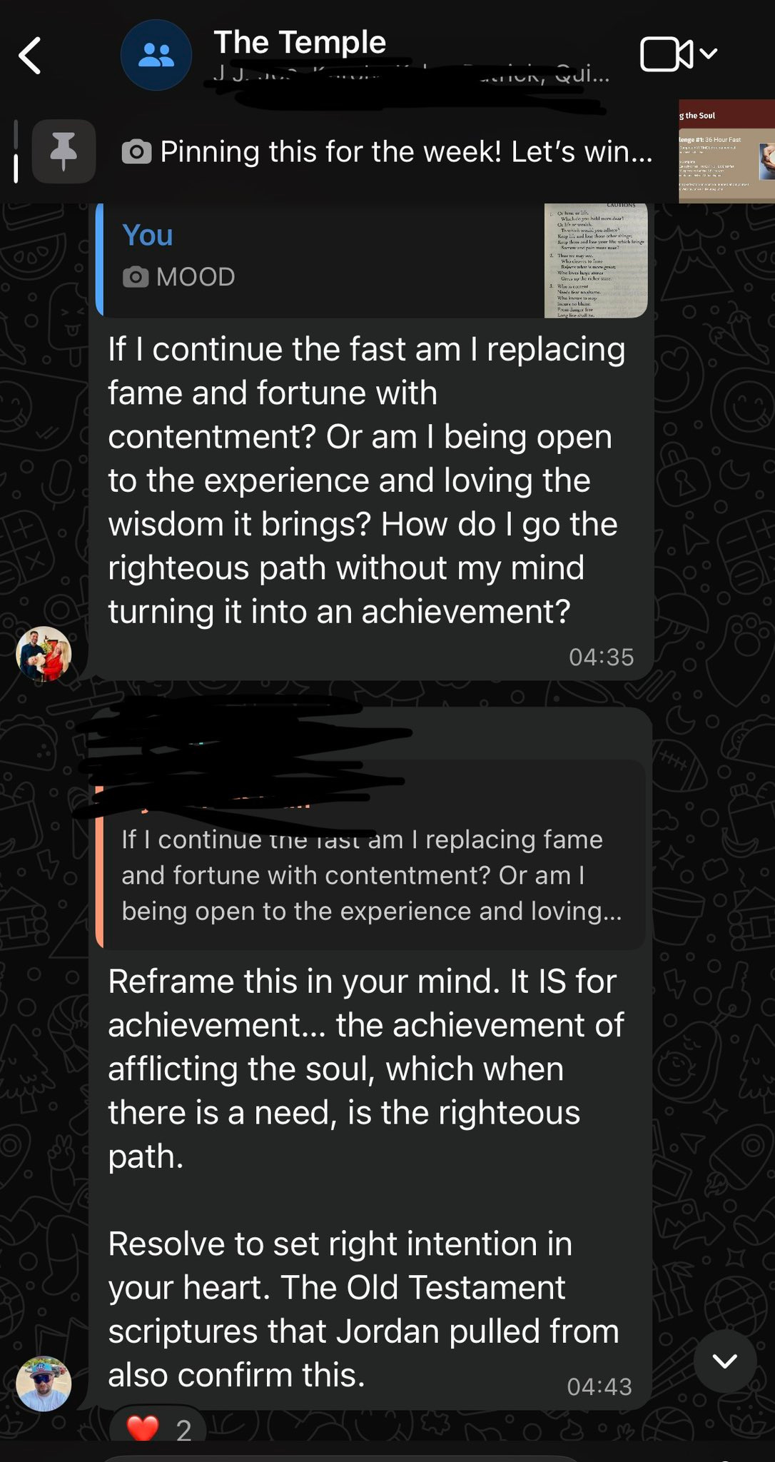 One of my guys used this opportunity to embody the atonement that accompanies the Jewish fast at Yom Kippur. In our group call, I brought up the Old Testament ideal of ‘Afflicting the Soul’ that is to deny bodily comfort in pursuit of spiritual purity.